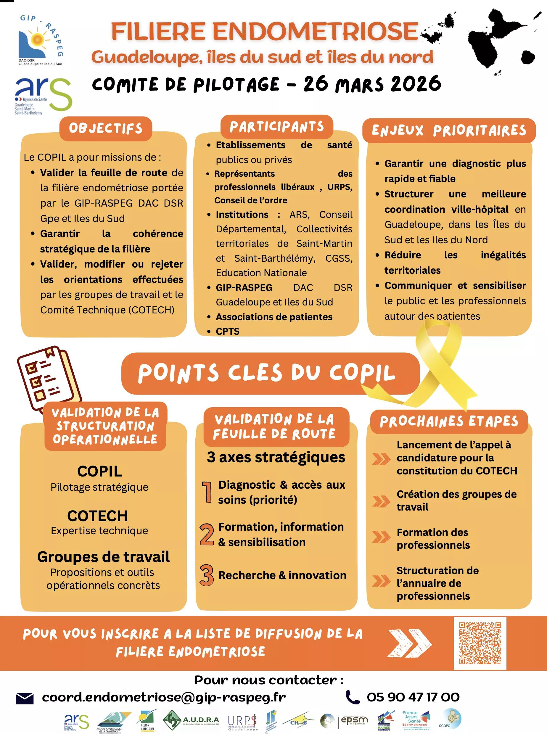 🎯 La filière endométriose de Guadeloupe a été officiellement créée en novembre 2025. Elle vise à structurer un parcours de soins cohérent, équitable et adapté pour les patientes, quels que soient leur âge et leur lieu de résidence sur le territoire.