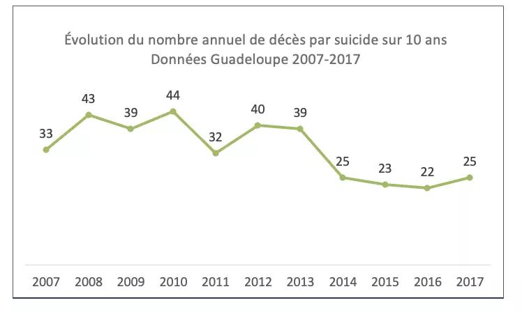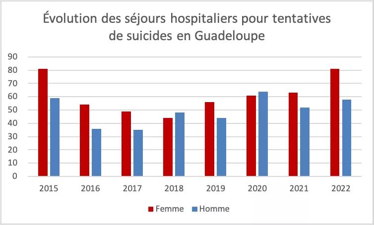 En Guadeloupe, le nombre de décès par suicide est de 25 pour l’année 2017 (voir le graphique n°1) et 139 tentatives de suicides en 2022 (voir graphique n°2) avec une proportion plus importante chez adolescentes et les jeunes femmes.