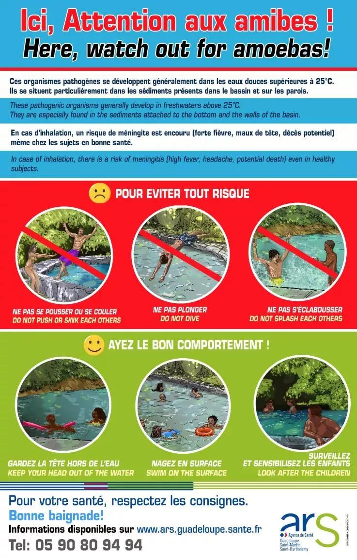 Depuis cette date, l'Agence de Santé, pilote un programme de surveillance environnementale spécifique aux sources chaudes. Chaque année, plusieurs campagnes de prélèvements et d'analyses sont réalisées en partenariat avec l'Institut Pasteur de Guadeloupe. Ces actions permettent de détecter la présence éventuelle d'amibes libres, d'informer la personne responsable de la baignade et d'adapter les mesures de prévention et d'information du public.