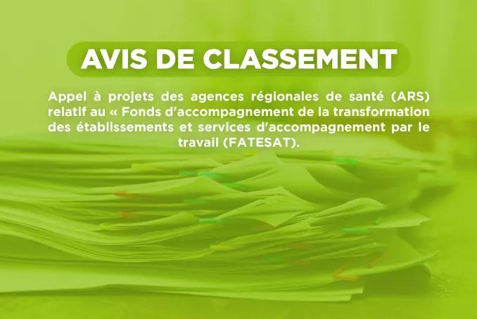 Avis de classement de l'appel à projets des agences régionales de santé (ARS) relatif au " Fonds d'accompagnement de la transformation des établissements et services d'accompagnement par le travail (FATESAT)"