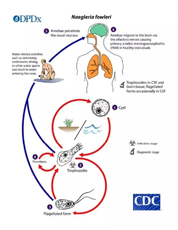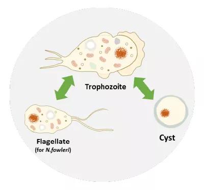 Naegleria fowleri est une amibe libre thermophile que l'on retrouve dans les eaux douces chaudes. Elle existe sous trois formes : le trophozoïte, forme active et mobile ; le kyste, forme de résistance, qui lui permet de survivre lorsque les conditions sont défavorables (manque de nourriture, dessèchement, variations de température, désinfection) ; et une forme flagellée, transitoire, qui apparait lorsque l'amibe est placée dans une eau pauvre en nutriments.